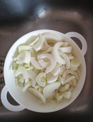 Tagliare a fettine i finocchi e lavarli sotto l'acqua corrente.